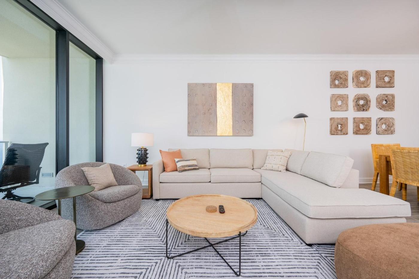 Three-Bedroom Apartment. This spacious apartment consists of 1 living room, 3 separate bedrooms and 3 bathrooms with a bath and a shower. In the well-fitted kitchen, guests will find a refrigerator, a dishwasher, kitchenware and an oven. This apartment is air-conditioned and features a TV with cable channels, a washing machine and a tea and coffee maker. The unit offers 6 beds. ;