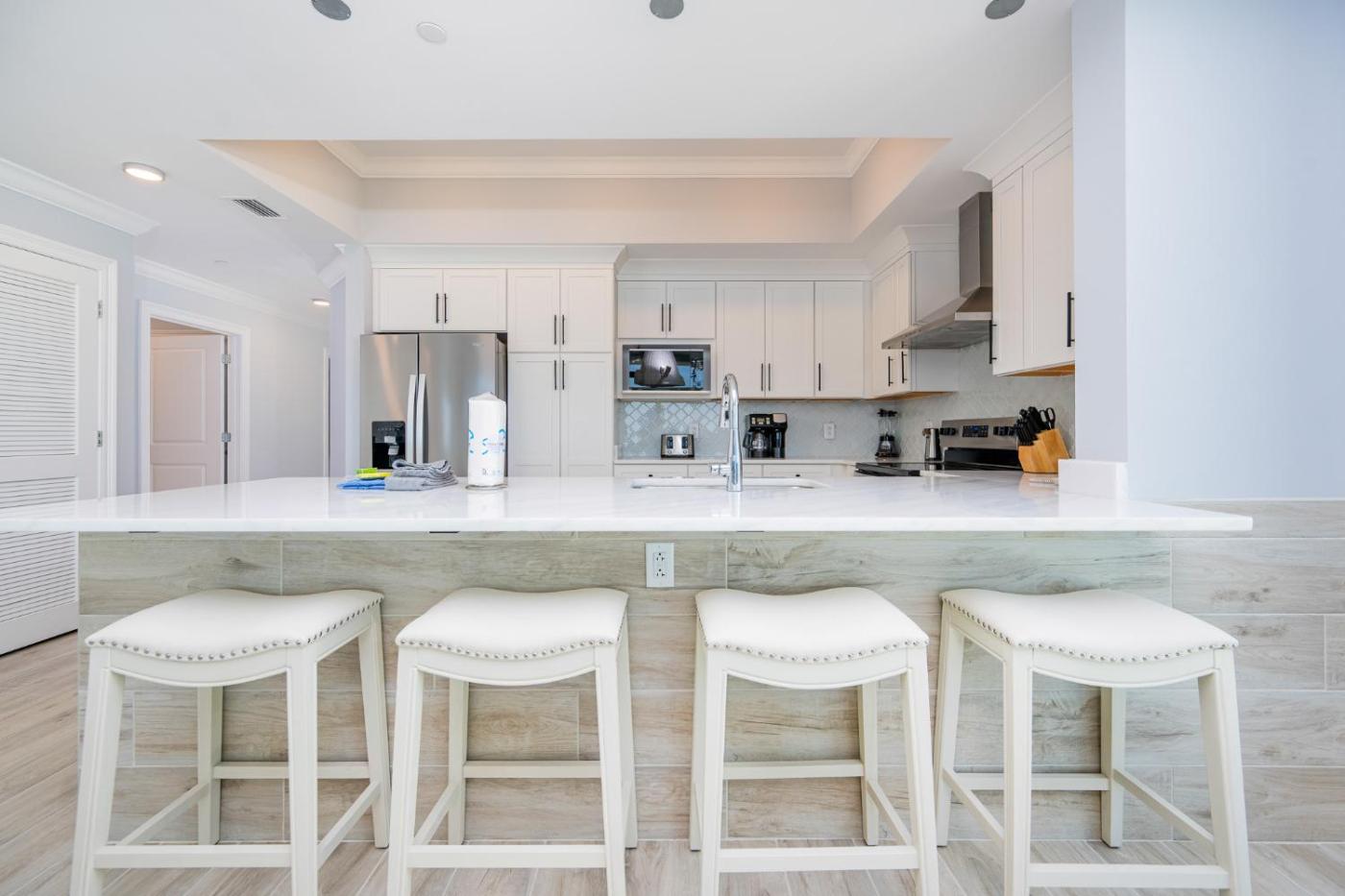 Four-Bedroom Apartment. This spacious apartment features 1 living room, 4 separate bedrooms and 4 bathrooms with a walk-in shower and a bath. Guests can make meals in the kitchen that has a refrigerator, a dishwasher, kitchenware and an oven. Boasting a terrace with sea views, this apartment also features air conditioning and a flat-screen TV with cable channels. The unit has 9 beds.